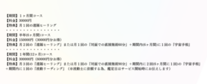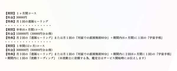 【期間】1ヶ月間コース 【料金】30000円 【特典】月1回の遠隔ヒーリング ・・・・・・・・・・・・・・・・ 【期間】半年(6ヶ月間)コース 【料金】150000円(30000円分お得) 【特典】月2回の『遠隔ヒーリング』または月1回の『対面での直接施術60分』+期間内(6ヶ月間)に1回の『宇宙手相』 ・・・・・・・・・・・・・・・・ 【期間】1年間(12ヶ月)コース 【料金】30000 2.png